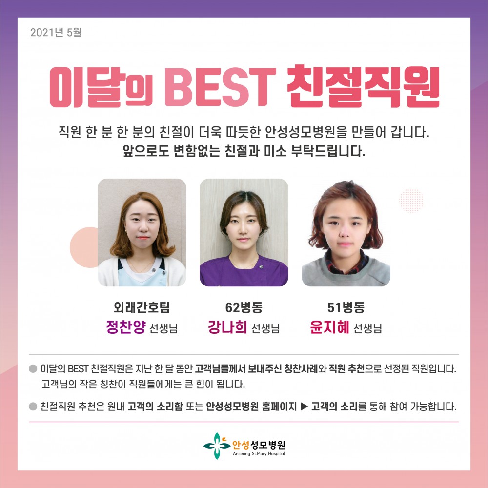 [시상식] 안성성모병원 이달의 친절직원_5월 페이지 정보 작성자 관리자 댓글 0건 조회 4,422회 작성일 21-05-03 08:38 본문 안성성모병원 5월 친절직원으로는 외래간호팀 정찬양 선생님, 62병동 강나희 선생님,51병동 윤지혜 선생님이 수상하였습니다. 수상하신 모든 분들 축하 드립니다. 목록 이전글[시상식] 안성성모병원 이달의 친절직원_6월 다음글[시상식] 안성성모병원 이달의 친절직원_4월 댓글목록 댓글목록 등록된 댓글이 없습니다.